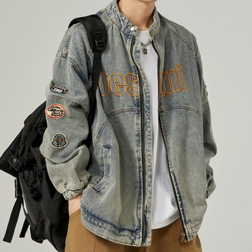 Retro Stand Collar Embroidery Denim Jacket