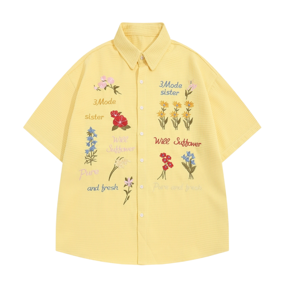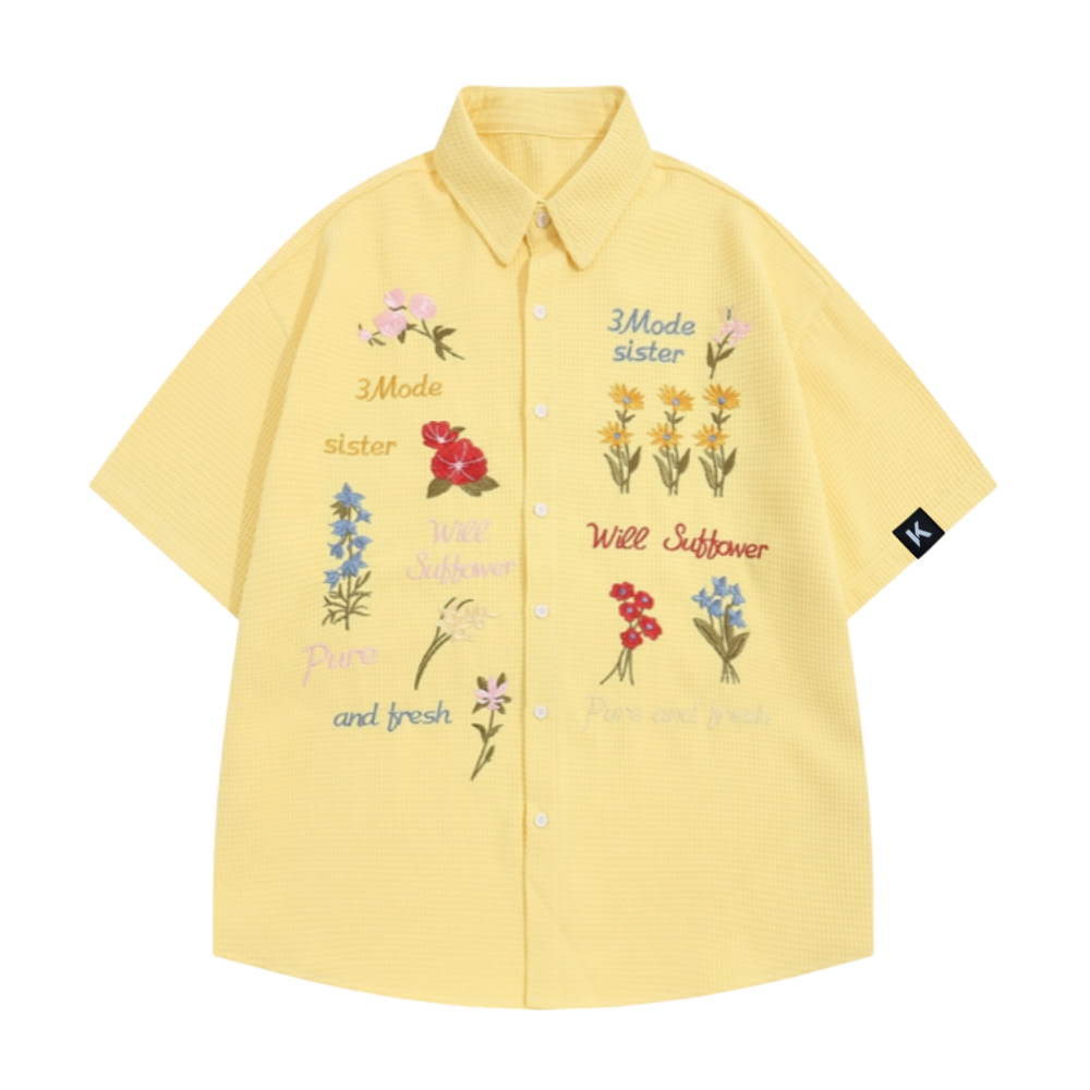 Retro Waffle Colored Floral Embroidered Shirt